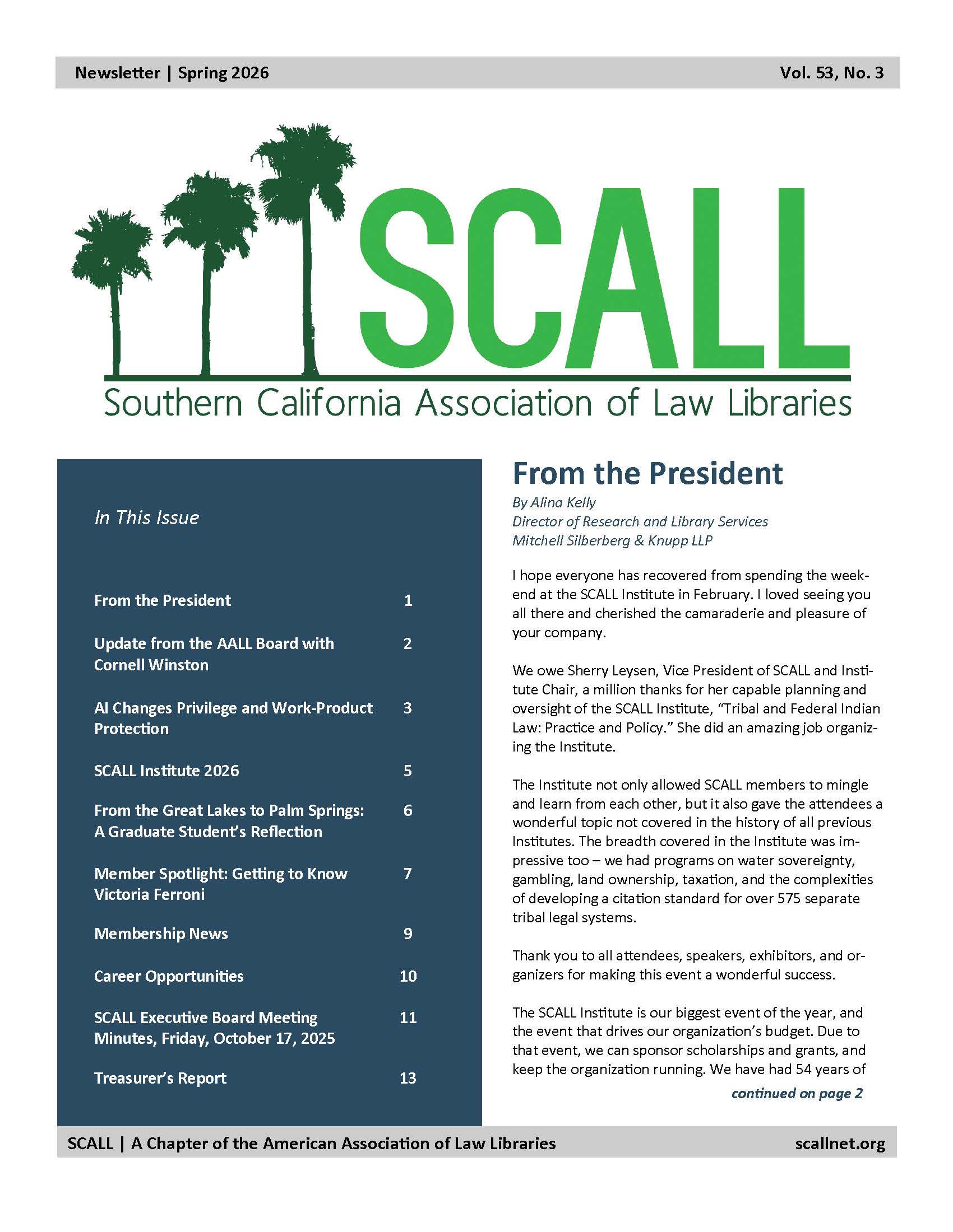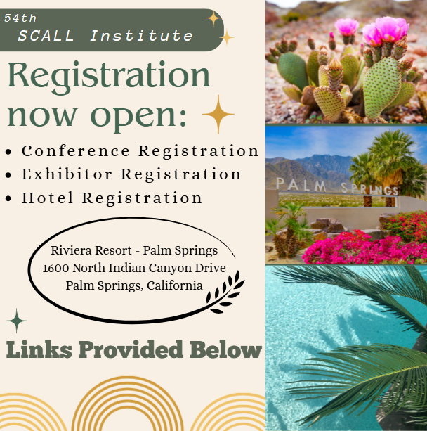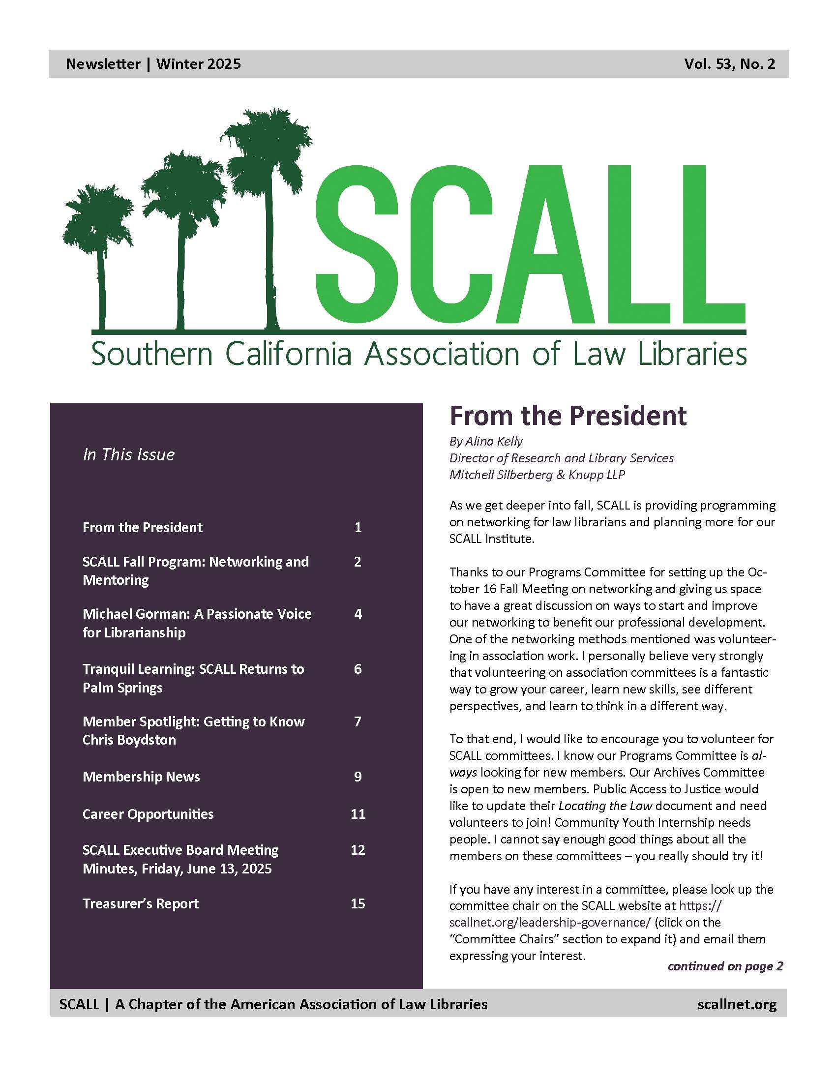 The Southern California Association of Law Libraries (SCALL) is a local chapter of the American Association of Law Libraries (AALL). SCALL was approved as a chapter in 1953 and has an active membership of over 300 librarians and information professionals from academic, private, state, and county law libraries in the Southern California area. SCALL sponsors an annual institute, has over 20 committees, publishes a chapter newsletter, runs a listserv, and maintains these web pages.